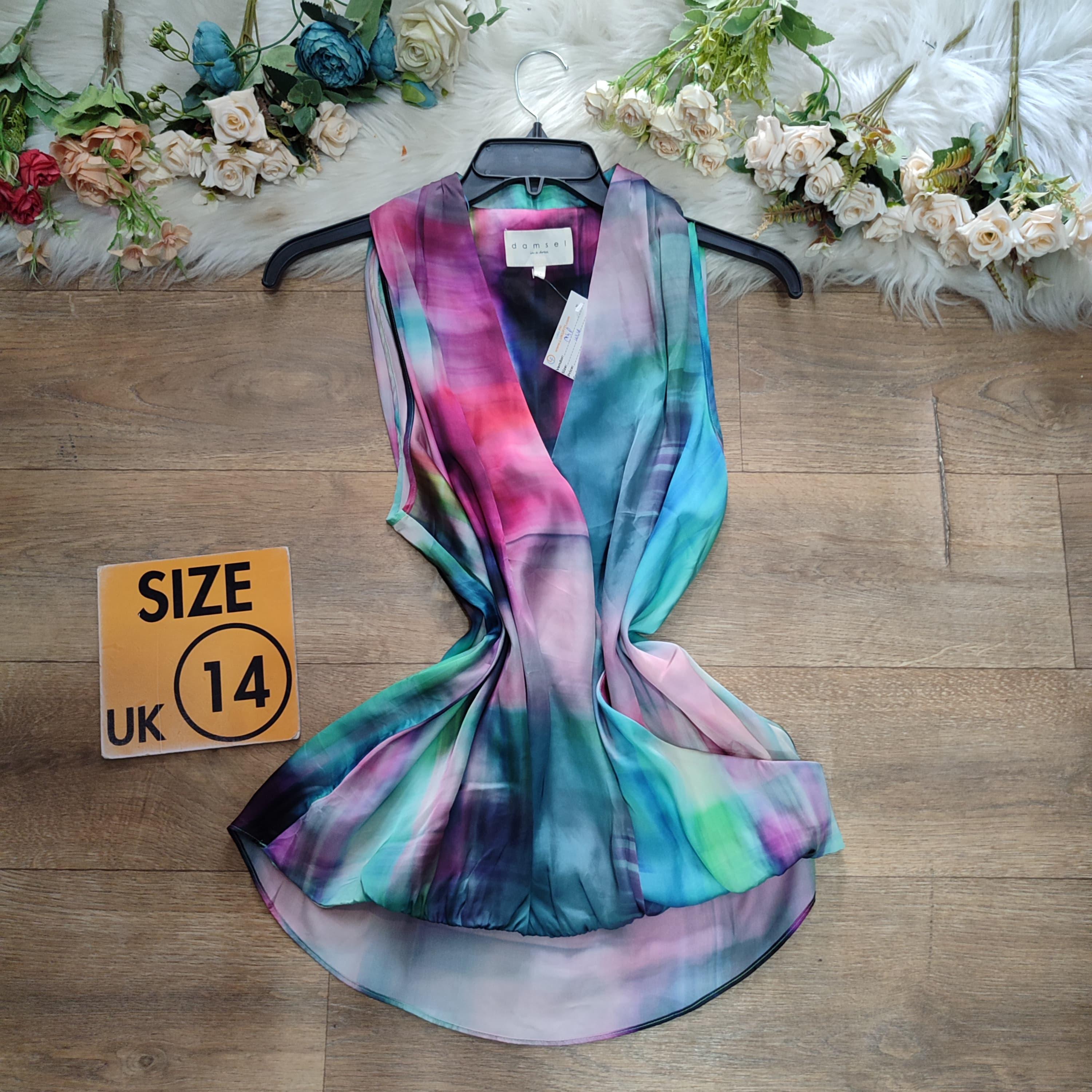 multicoloured sleeveless, size 14, carefully thrifted and well vetted,